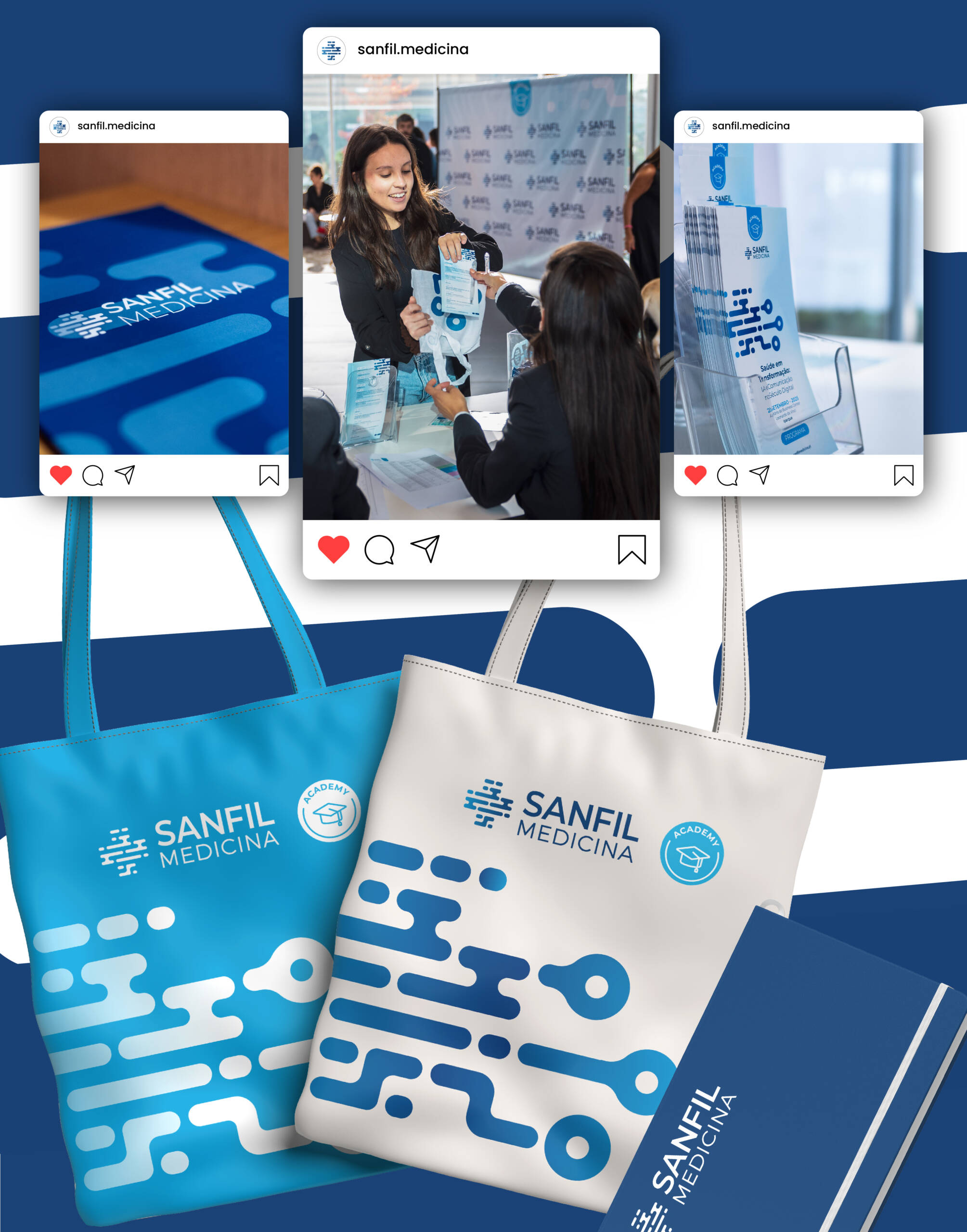 Mas o trabalho não ficou pelas redes. Criámos todos os materiais físicos para o primeiro Congresso Sanfil Medicina, com design editorial limpo, credível e à altura de um evento profissional.
